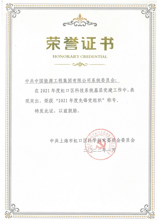 會議的最后,對虹口區科技系統基層黨建工作中表現突出的黨組織進行了表彰,中國能源工程集團有限公司系統黨委榮獲“2021年度先鋒黨組織”榮譽稱號。