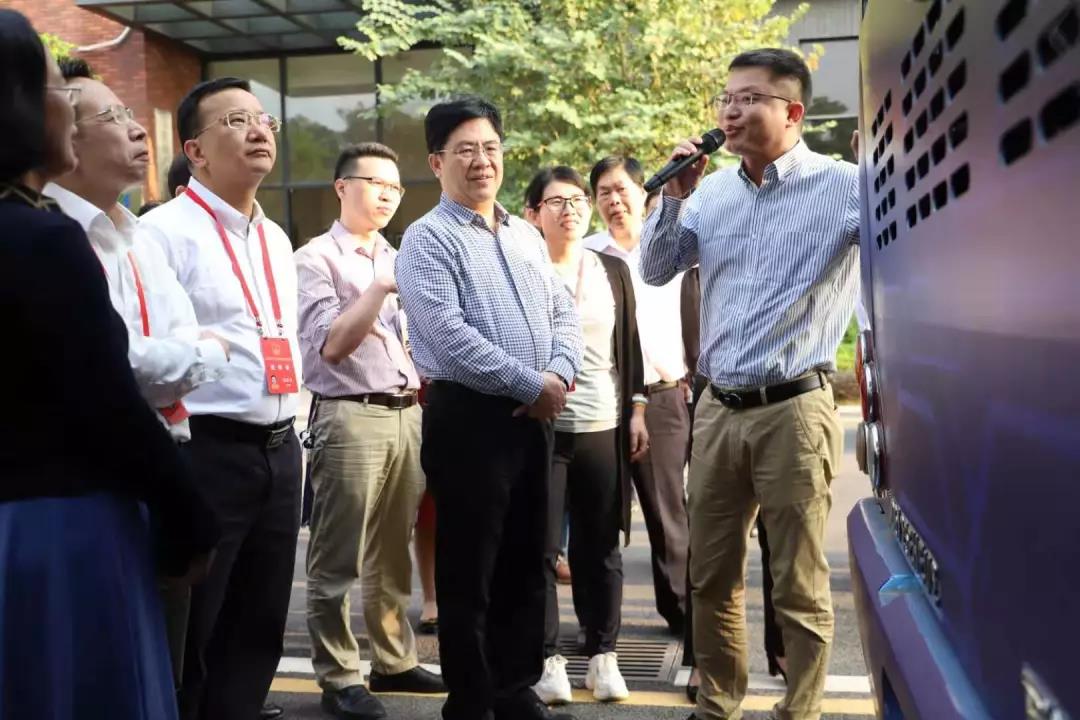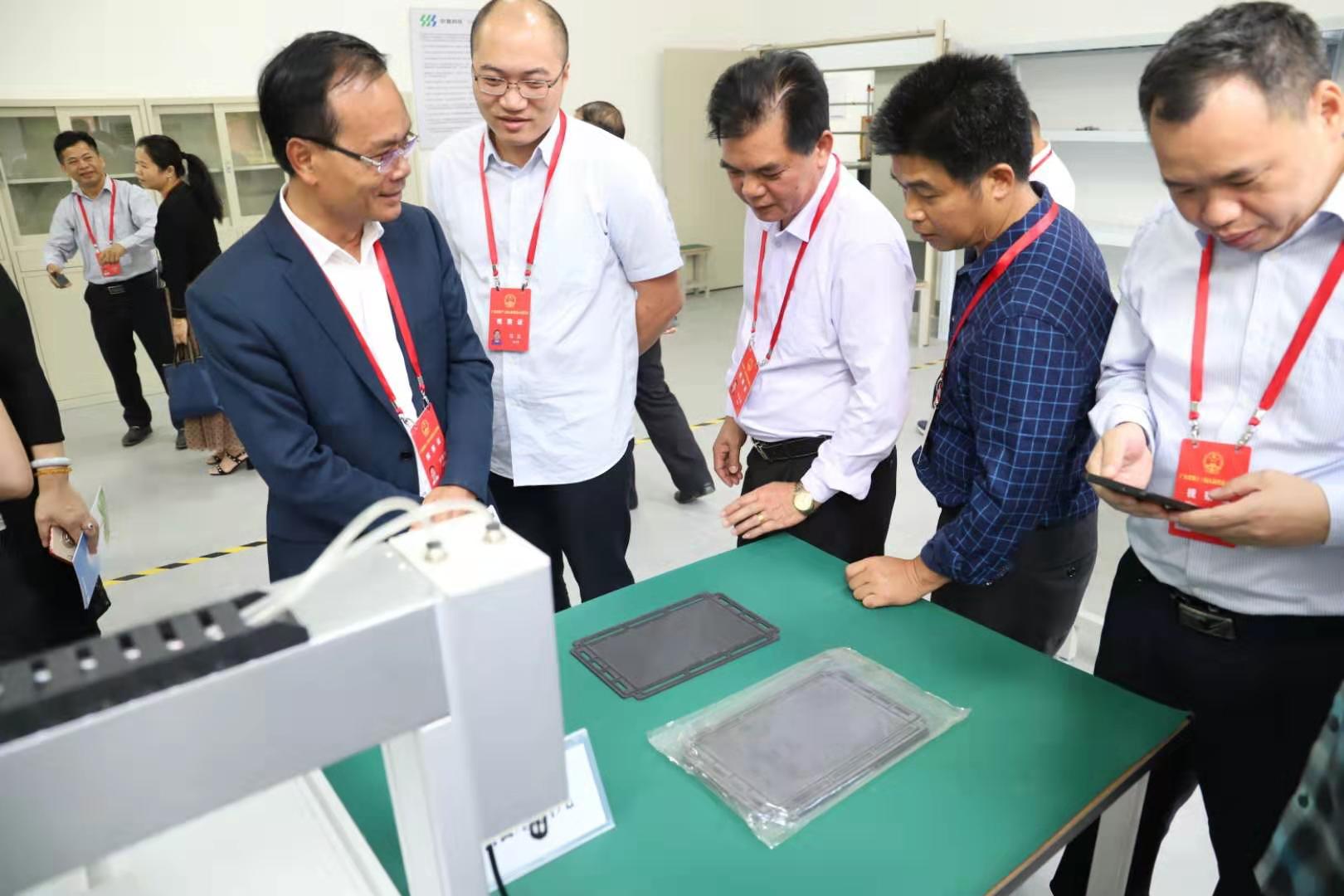 鄧永明一行首先參觀了中氫科技茂名氫燃料電池電堆產(chǎn)品展示中心,了解了正在建設(shè)的氫燃料電池技術(shù)示范生產(chǎn)基地的相關(guān)情況。在引導(dǎo)下,代表們觀摩了搭載著由中氫科技自主研發(fā)的60kW氫燃料電池發(fā)動機系統(tǒng)的12米奇瑞氫燃料電池城市客車。