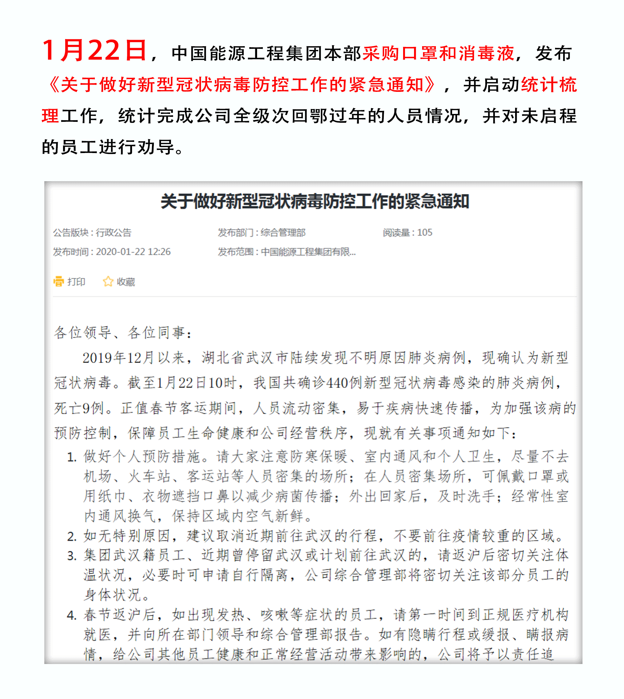新型冠狀病毒感染的肺炎疫情持續(xù)肆虐,中國能源工程集團(tuán)認(rèn)真貫徹落實(shí)習(xí)近平總書記重要指示精神,按照國家和地方各級(jí)政府,國機(jī)集團(tuán)的安排部署,全局謀劃、迅速行動(dòng)、系統(tǒng)推進(jìn)防疫工作。