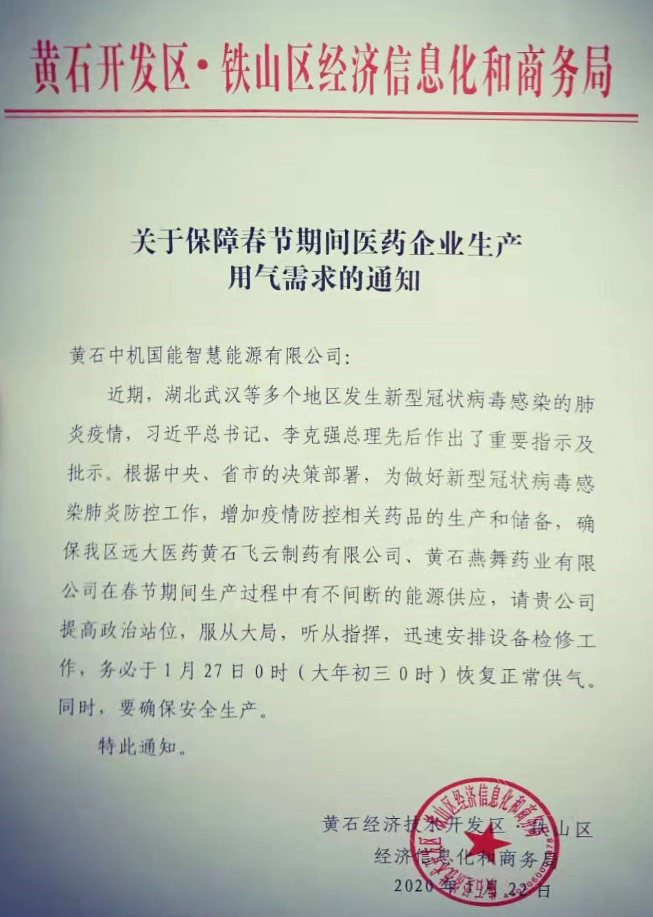 中國能源工程集團所屬中機國能電力集團有限公司負責運營的黃石項目承擔著為所在園區多家醫藥企業供應蒸汽的工作。其中一家用氣企業遠大醫藥黃石飛云制藥公司是前線防疫用抗病毒顆粒的生產商。1月22日,接到政府指令,因春節期間該制藥公司需不間斷生產,故其生產所需能源供應同樣不能停。對此,黃石項目現場第一時間響應,服從大局,聽從指揮。