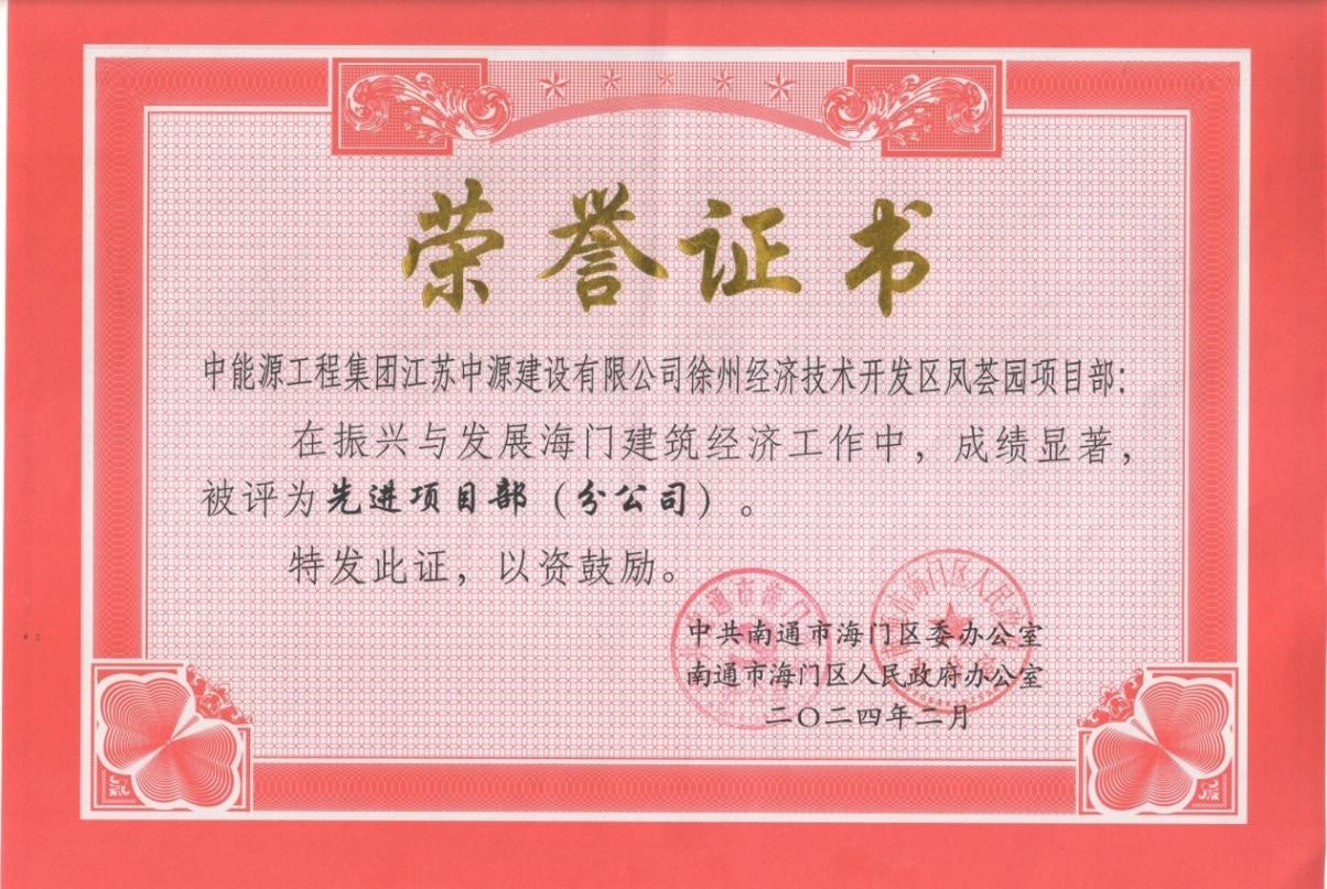 2024年2月20日,中國能源工程集團(tuán)所屬中能源工程集團(tuán)江蘇中源建設(shè)有限公司(以下簡稱中源建設(shè))在2024年南通市海門區(qū)建筑業(yè)高質(zhì)量發(fā)展大會上受到中共南通市海門區(qū)委、區(qū)政府的隆重表彰。其中中源建設(shè)徐州經(jīng)濟(jì)技術(shù)開發(fā)區(qū)鳳薈園項(xiàng)目部被評為先進(jìn)項(xiàng)目部、郭勇同志和馮明同志被評為優(yōu)秀建造師、馬宇博同志被評為先進(jìn)個(gè)人。