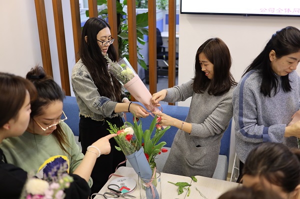 一早,公司為各崗位的女職工們準備了一份“小禮物”。彩玫、康乃馨、香檳、相思梅、郁金香,各種花材供各位女神選擇與搭配,在送出祝福的同時讓大家把盎然的春意帶回家。