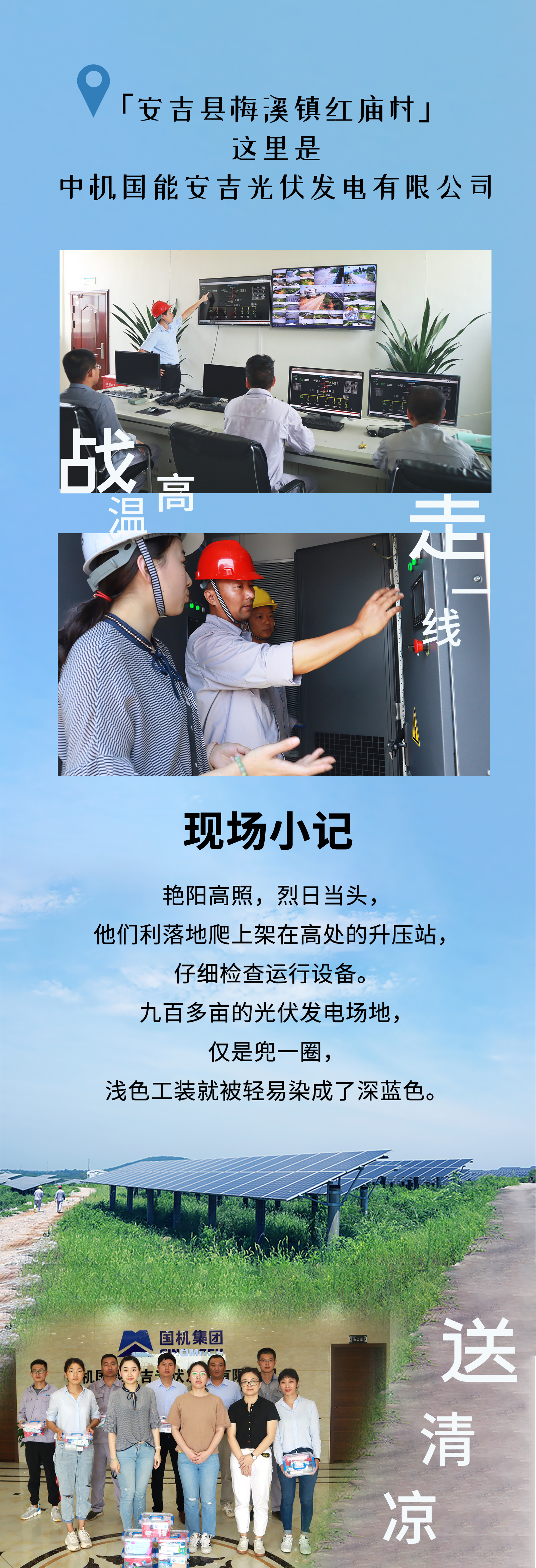 中國能源工程集團工會組織相關人員及中電集團相關人員赴中機國能安吉光伏發電有限公司(簡稱“安吉光伏”)項目現場,發放防暑降溫物資,關心一線員工。